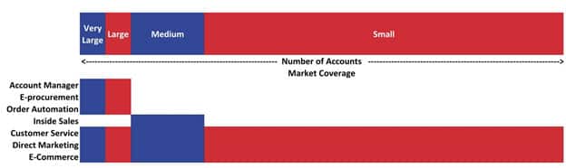 The benefit for a distributor is that a small or medium-sized account can be served far more cost-effectively. But for this to work, channel alignment is key. Field sales may serve large and very large accounts, which would also be supported by e-procurement and order automation. But for the remaining 90% or so of accounts, a lower-cost, lower-touch model is important. Medium-sized accounts with potential can be nurtured by a proactive inside sales force. And all accounts, including the small, can be served by ecommerce, customer service and direct marketing.