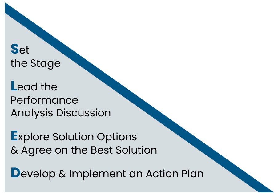 - Explore Solution Options and Agree on the Best One: Determine the type of solution, such as training, coaching, counseling, feedback or something else, plus content or best practices to improve performance.