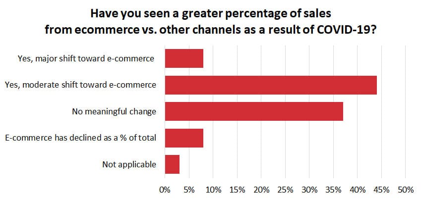 In an April 2020 survey, Distribution Strategy Group found that the majority of respondents (52%) saw a moderate or major shift to online buying as a percentage of sales vs. other channels as a result of the COVID-19 pandemic and resulting lockdowns.