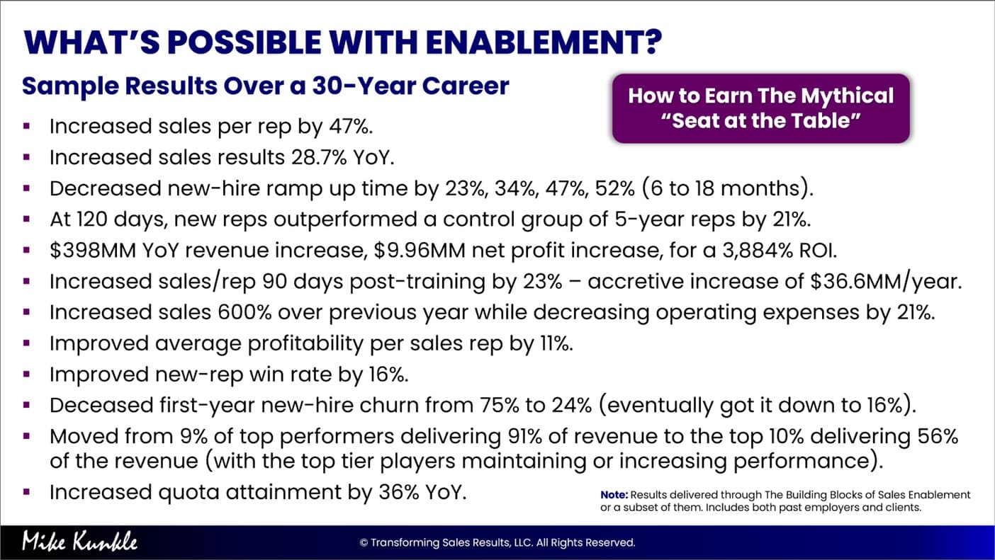 My quest continued through several companies and roles until the first iteration of The Building Blocks of Sales Enablement was formed and implemented in 2003-04. Since then, I have evolved the framework and systems, and I even published a book about it in September 2021.