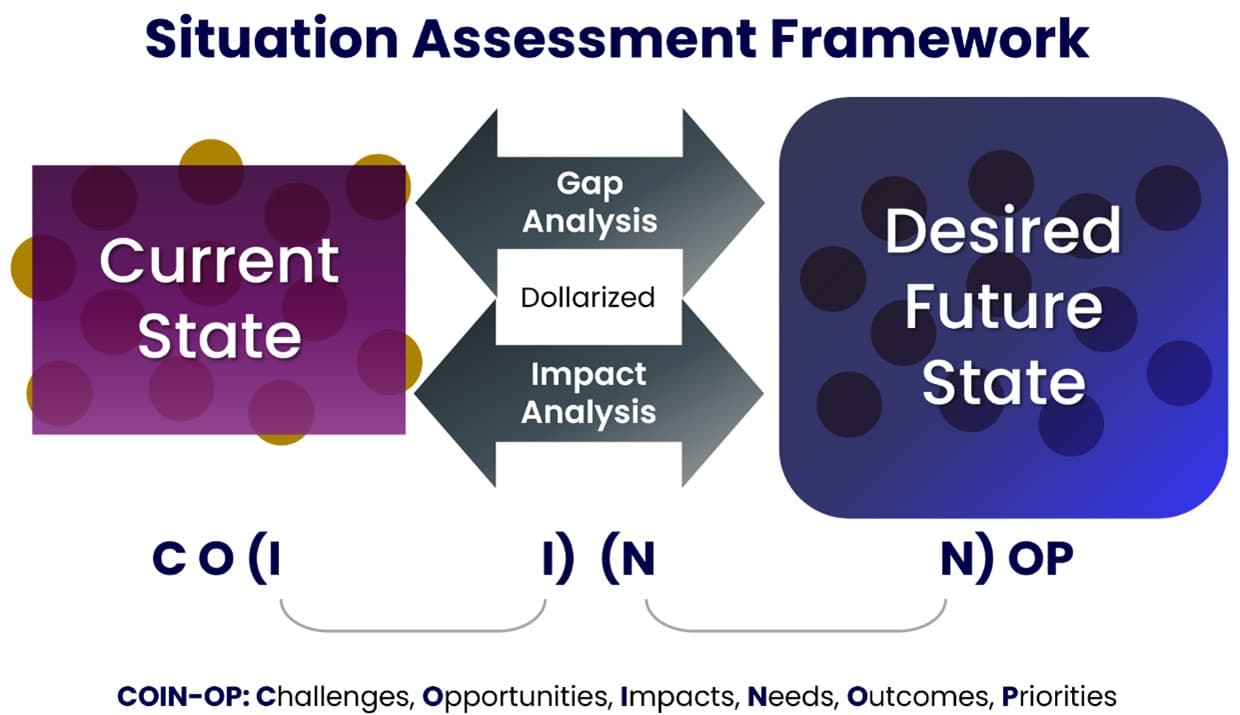 - How: Document the current state of sales performance compared to the desired future state using the COIN-OP framework (Challenges, Opportunities, Impacts, Needs, Outcomes, Priorities) and conduct a thorough gap and impact analysis.