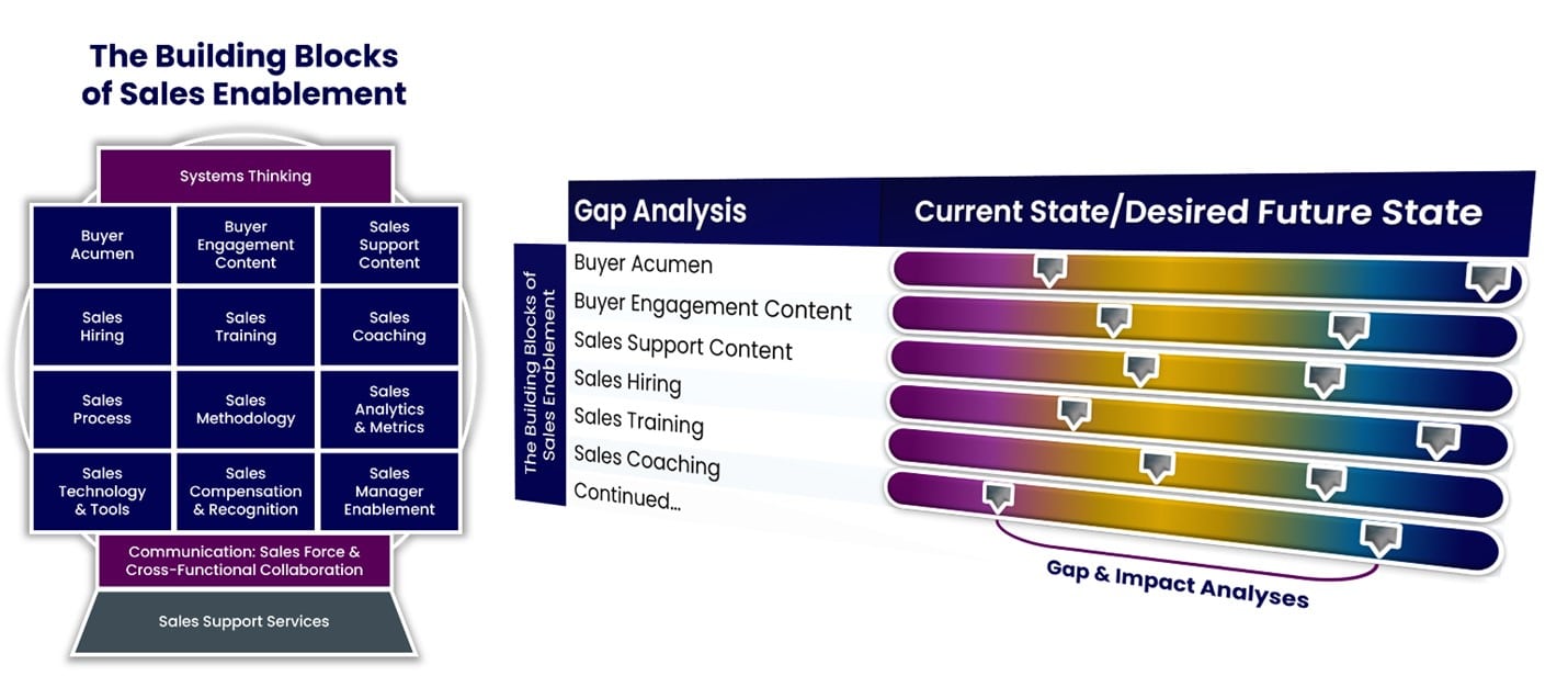 - Outputs: The outcome of this assessment should include clear goals and objectives for the sales force, as well as a comprehensive gap and impact analysis. This information will culminate in a compelling Sales Enablement business case.