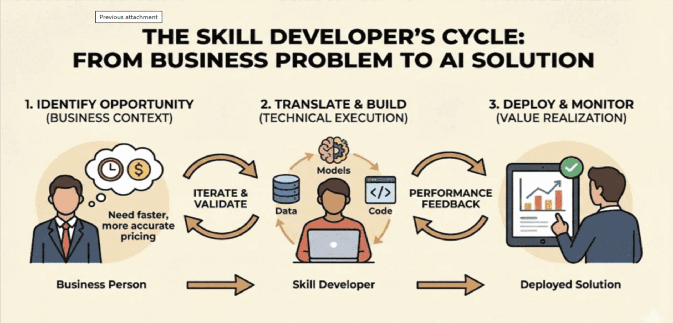 Create space for iteration. Notice that the diagram has feedback loops everywhere—between the businessperson and the Skill Developer, between building and deploying, between performance and refinement. AI solutions aren’t waterfall projects. They’re iterative. If your organization only knows how to do big, long, formal projects, you’ll struggle to capture the value AI offers.