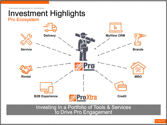 We know there is significant opportunity to better serve our Pro customers, who we believe represent about 45 percent of our sales today. The value proposition that we are creating for our Pros is a comprehensive ecosystem that encompasses product, exclusive brands, delivery, credit, service, digital capabilities, tool rental and more. We believe what we are building is unique to the marketplace. The store experience is being enhanced, delivery is a key component that we are building out through our supply chain investments,and the B2B site experience is being designed to make it easier for our Pros to engage with The Home Depot from the job site.”
