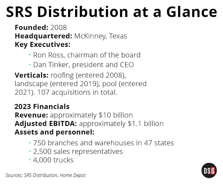 What SRS brings Home Depot is a nationwide distribution company geared to serving big buyers. Founded in 2008 and backed by private equity, SRS has acquired 107 distribution companies, initially in roofing and more recently in landscaping and pool supply.