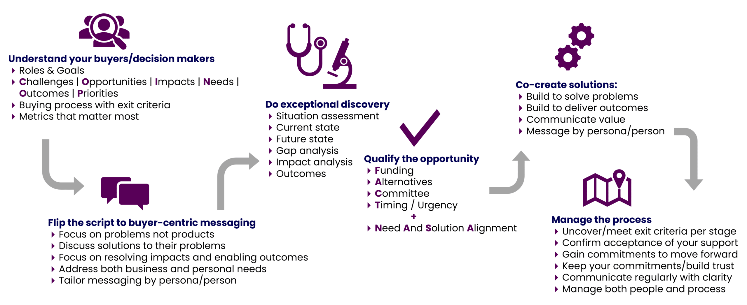- Make the shift to a sales methodology that is purposefully buyer-centric, consultative, value-focused and outcome-oriented.
