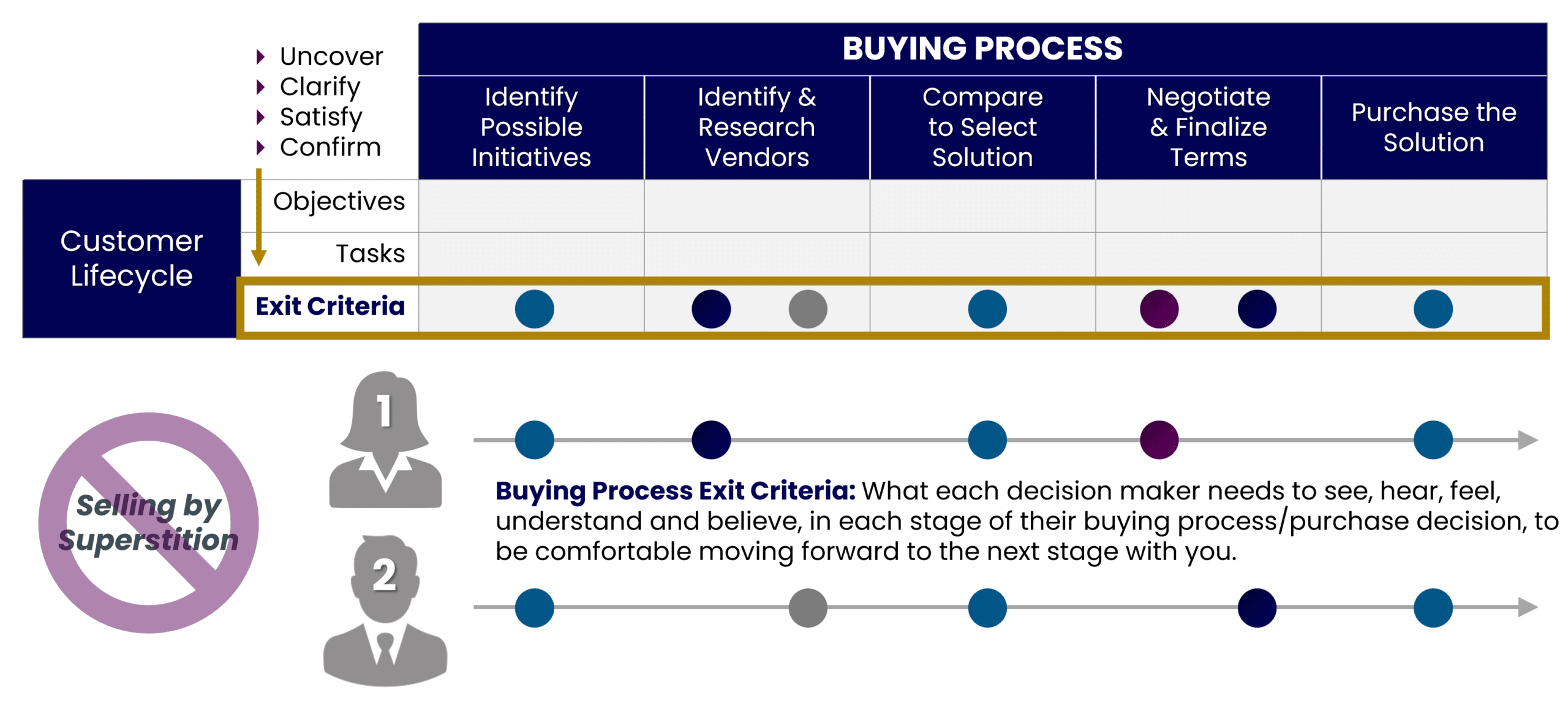- It’s also about understanding their decision criteria (or buying process exit criteria), by decision maker, by process stage (because not everyone has the same criteria in each stage) and uncovering, clarifying, satisfying and confirming satisfaction of those criteria, to help them make the best decisions possible and improve your own win rates and account growth.