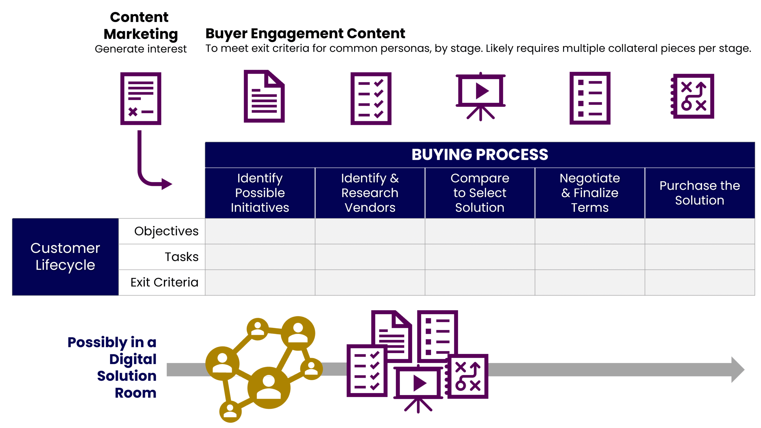 - Build buyer engagement content and sales collateral that support the buying journey you uncovered above, to satisfy each of your persona’s buying process exit criteria, per stage of their journey. Test, test, test and refine. Content should be developed to answer buyer questions in each stage of their journey, to support their purchase decision. Reduce friction and make it easy to buy from you.
