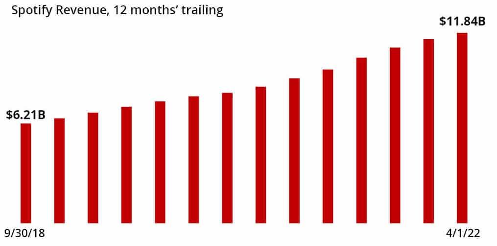 Although Spotify’s music library of 70 million songs is similar to other streaming services, it has over 422 million highly engaged users and 1.5 times more market share than Apple Music, its closest competitor. In addition, on average, Spotify’s listeners engage with its platform 61 times per month. Comparatively, Apple Music listeners engage with its platform roughly 12 times per month, 5 times less often.