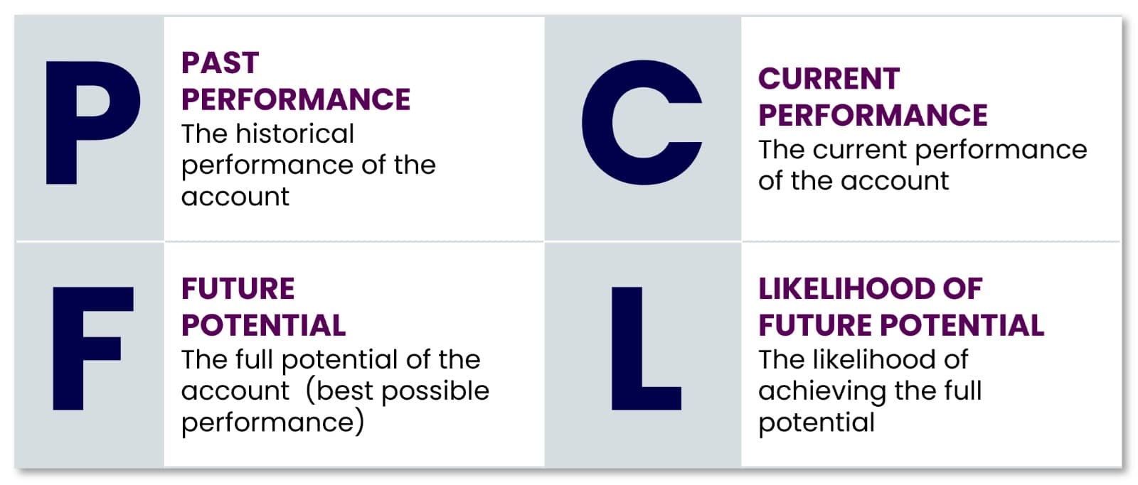In PCF-L analysis, you score each account’s history (P) and current performance (C) based on the metrics that are most meaningful to your company (such as revenue, profitability, recency, frequency, product mix, etc.). Then, based on your current understanding of the account and situation, you estimate the best-possible, best-case future potential (F) and your estimate of the likelihood of achieving that potential (L). I often use a Likert scale of 1-5 (1 being low; 5 being high), but I have seen 1-10 used as well.