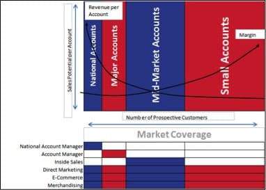 To cost effectively growth house accounts from 5 percent to 12.5 percent per year requires proper channel alignment. This means that there is a cost effective channel for acquiring and serving large, mid-size, and small customers. Figure 1 shows a sales and marketing map that works for well for house accounts including mid-market accounts and small accounts. For the mid-market accounts, the primary channel is inside sales, but is also supported by direct marketing and e-commerce. Small accounts are primarily handled through direct marketing and e-commerce.
