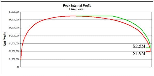 Measuring net profit, including cost-to-serve, at the customer level is a powerful starting point for assessing where customers fall on this spectrum. Plot the peak internal profit (PIP) by starting with the most profitable transaction and proceeding to the least profitable transaction as shown in Figure 3.