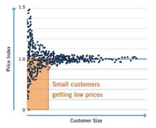 Figure 2 plots the size of the customer on the X-axis versus the price they pay relative to list price on the Y-axis. The area highlighted below 1.0 on the Y-axis shows small customers who are purchasing at a significant discount. These discounts are invariably offered for no apparent reason other than force of habit and belief that it is necessary to win or maintain the business.