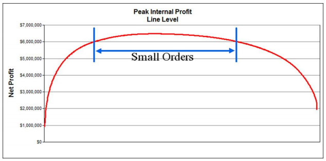 This curve, called a whale curve because of its shape, reaches a point of peak internal profit near the middle. Remaining unprofitable transactions will reduce the peak internal profit. For a typical wholesale distribution company, only 20 percent to 25 percent of their PIP goes to the bottom line