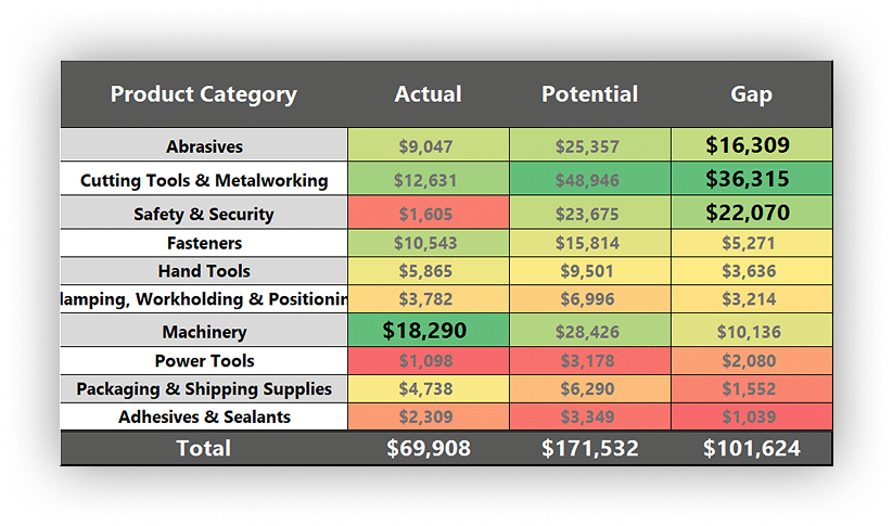 Our proprietary algorithms analyze your customer data alongside firmographic information from over 50 million companies. This reveals spending gaps and helps quantify each customer’s potential value.