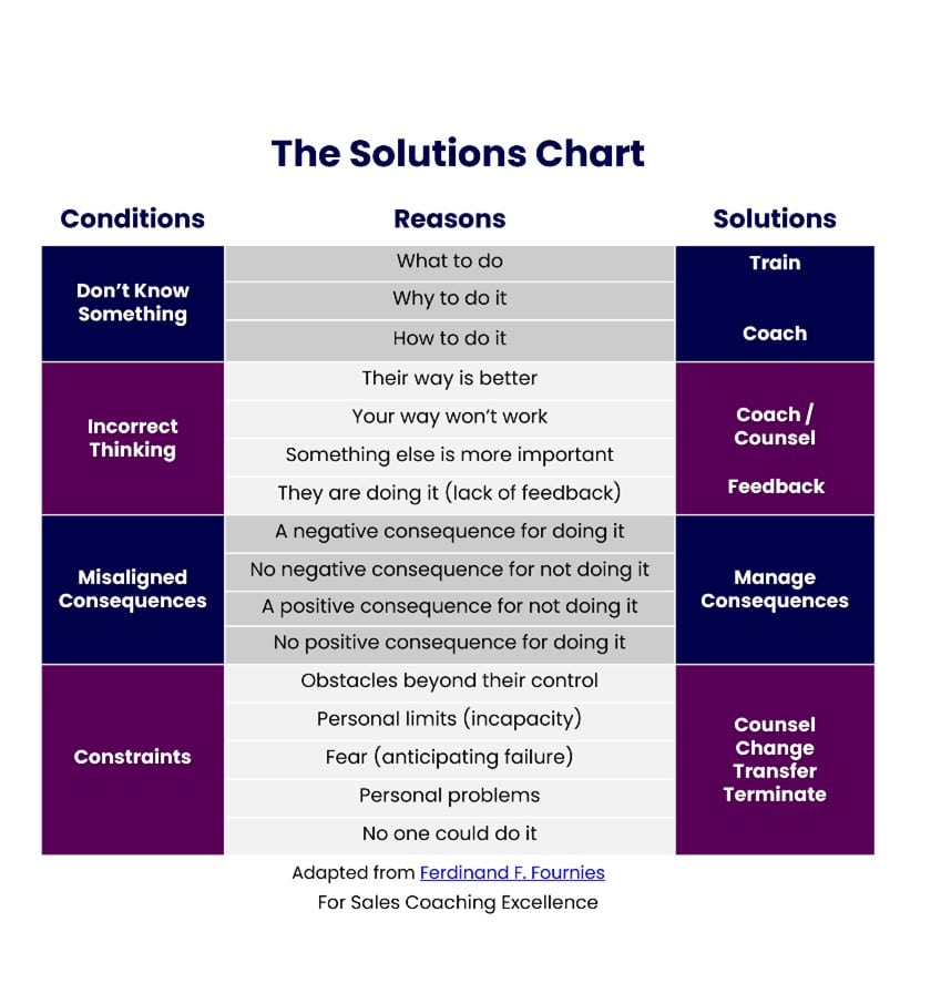 The Solutions Chart is from my Sales Coaching Excellence program (adapted from Ferdinand F. Fournies, with permission) and most managers find it very helpful in determining when field training or sales coaching are the right solutions, and also – equally as important – when they won’t fix the issue at hand.