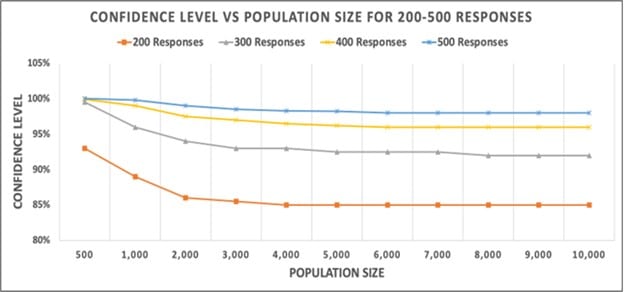 Let’s assume there is a 5% margin of error and evaluate the confidence level when there are between 500-10,000 people in a population and between 200-500 respondents in a survey (Figure 1). If we want the confidence level to be at least 90%, 200 respondents is only efficient when the population size is 500 people. However, if we have 300 respondents or more the confidence level is always 90% or larger regardless of the population size.
