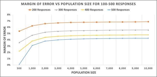 When we assume the confidence level is 95% with the same population and respondent sizes, we verify that we need at least 300 responses (Figure 2). When there are only 200 responses, the margin of error is larger than 5%, regardless of population size. At 300 responses, the margin of error is hovers around 5%. At 400 and 500 responses the margin of error is even lower.