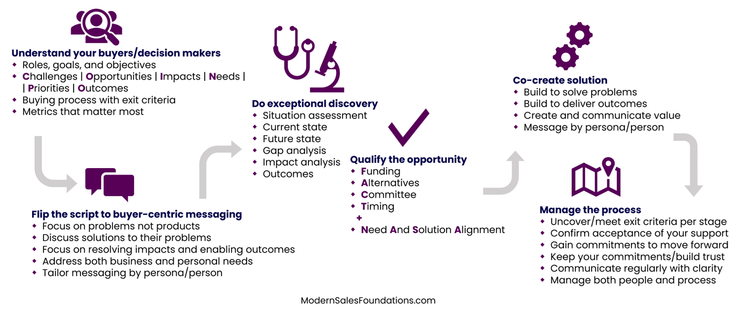 How do you do this? You can use various tools, such as buyer personas, buyer journey maps, value stories, sales plays and adjusted messaging. You can also use various techniques, such as conducting far deeper discovery, qualifying appropriately and building compelling business cases. The key is to tailor your sales approach to your buyer’s situation – their challenges, opportunities, impacts, outcomes, and priorities – and to deliver value at every touchpoint, from their perspective.